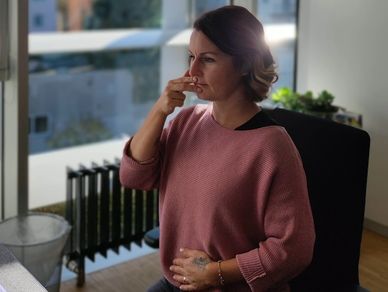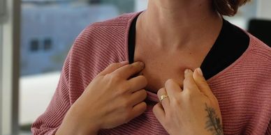 Unter deinen Schlüsselbeinen gibt es 2 Akupunkturpunkte welche sich Niere 27 nennen. Halte/massiere diese mit deinem Daumen und Mittelfinger und lege die freie Hand wieder auf deinen Bauchnabel (halten/kreisen)